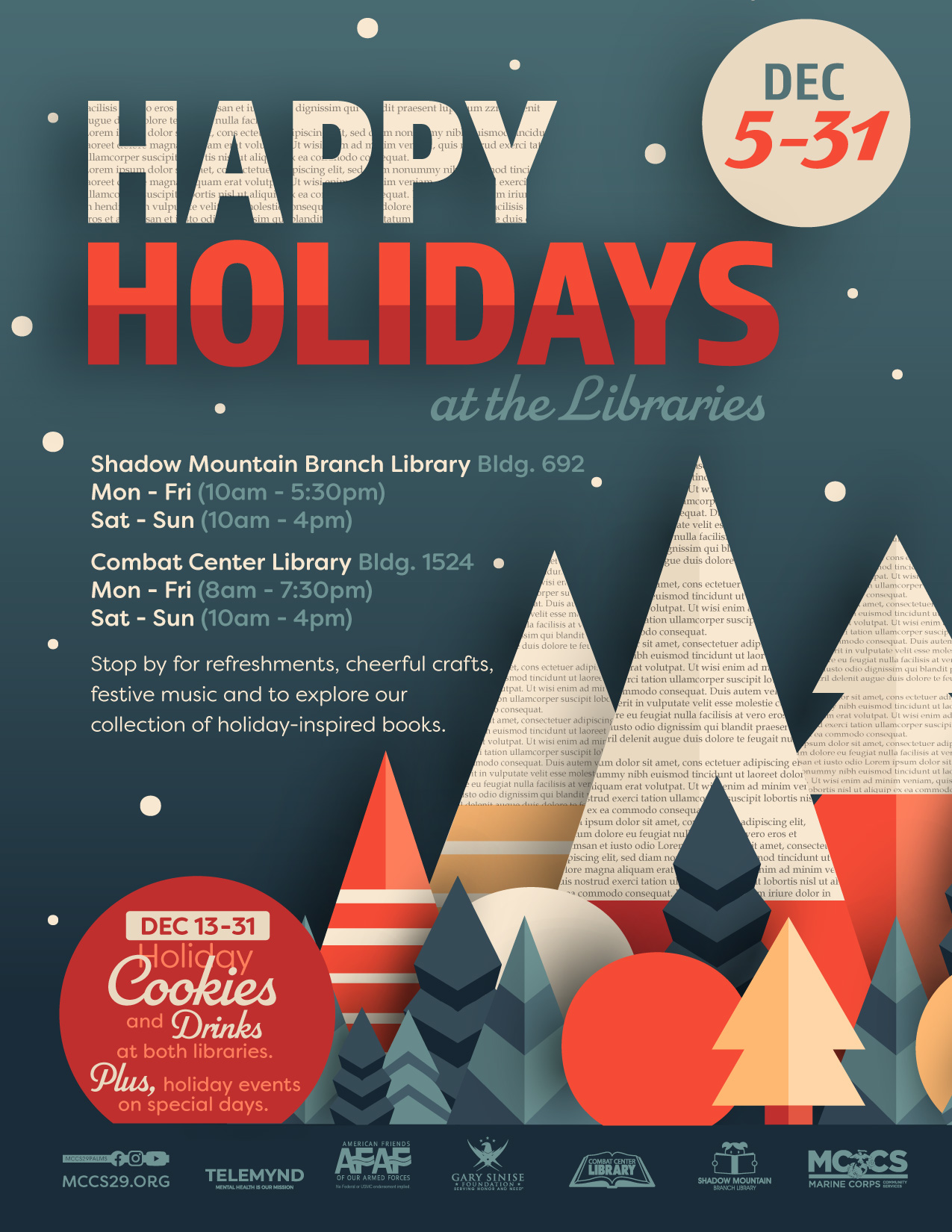 Holidays cookies and drinks available at both libraries. Plus, holiday events on special days.