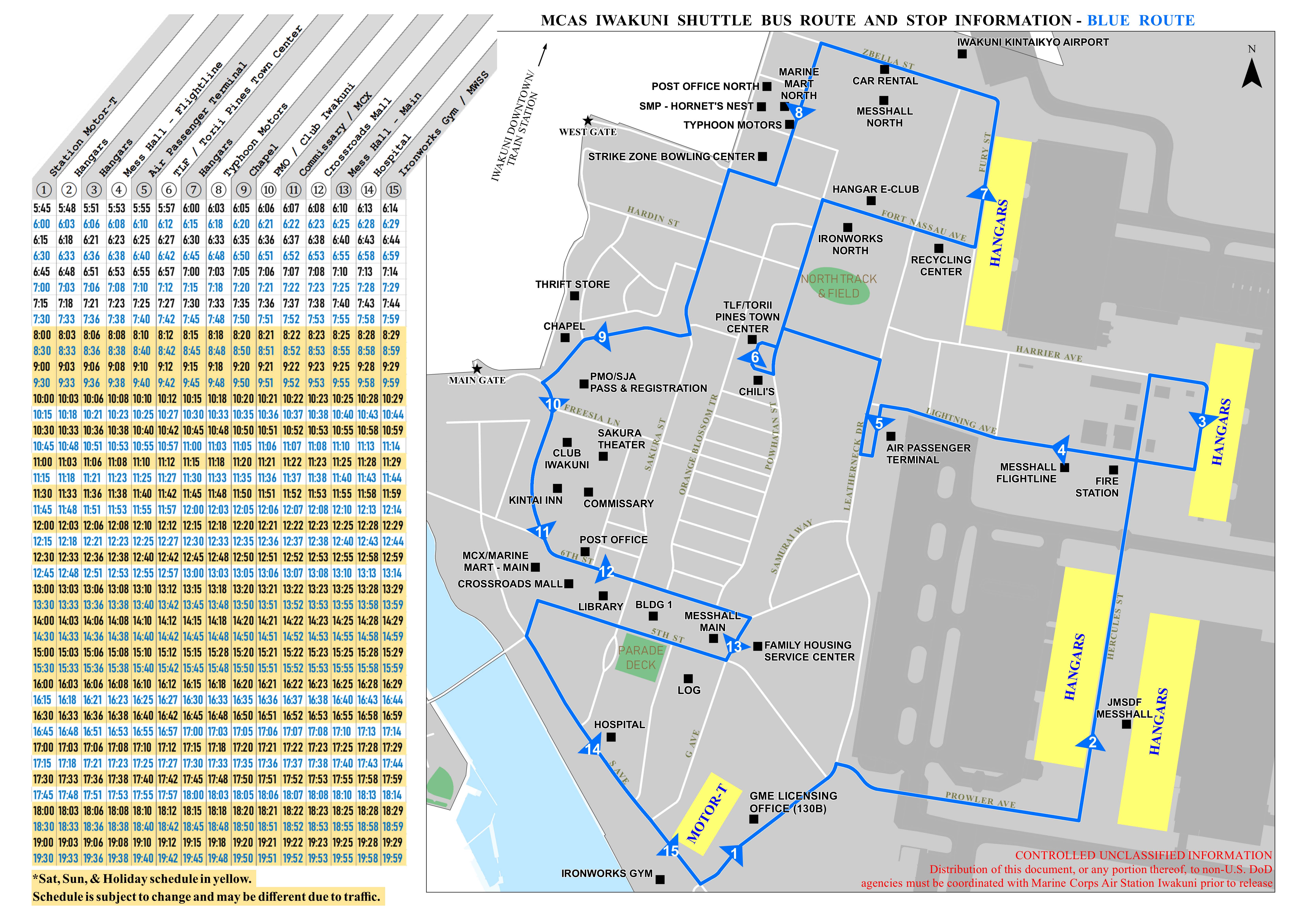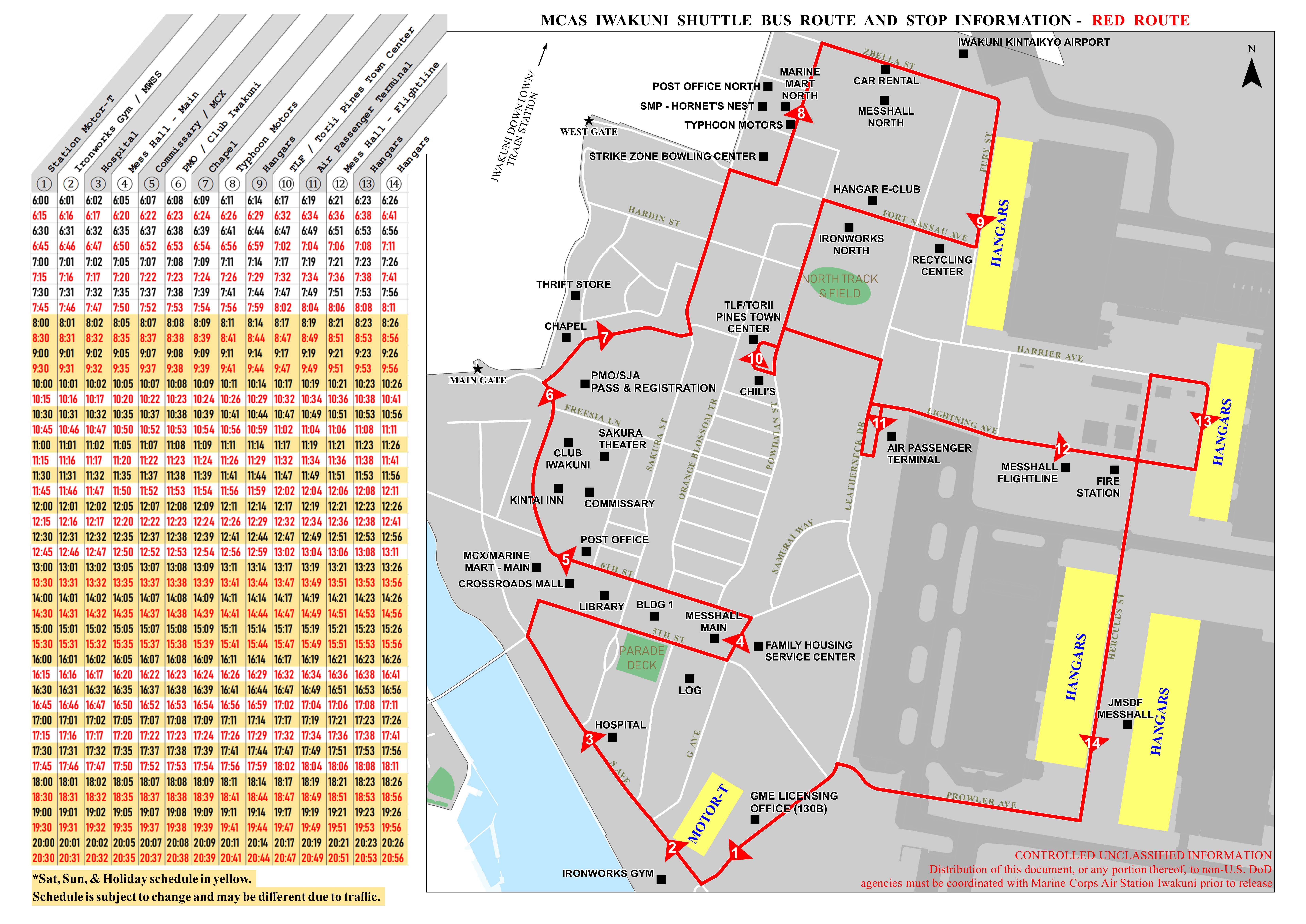 - The Red & Blue bus routes are a clockwise and counter-clockwise route, respectively, throughout MCAS Iwakuni.