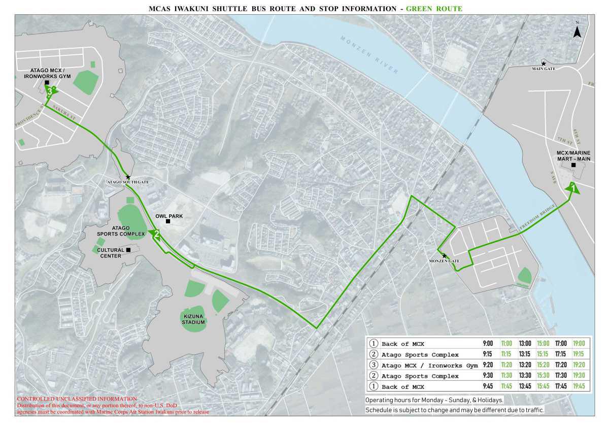- The Green route is a shuttle between MCAS Iwakuni, the Atago Sports Complex, and the Atago Housing Annex.